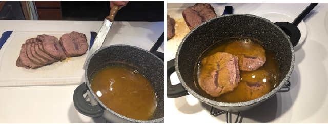 -tagliare la carne a fette spesse 5 mm, impiattare e coprire le fette con il sughetto.