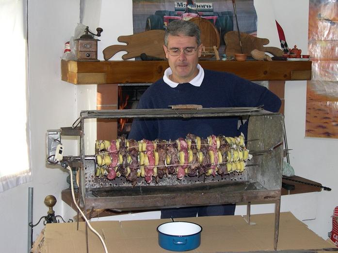 Una volta preparate le foglie di salvia con la fettina di lardo in quantità industriale e le patate tagliate a fettine , si inizia con le fettine di maiale a confezionare degli involtini ripieni con la salvia ed il lardo, si inizia a confezionare lo spiedo che alla fine si presenterà così: