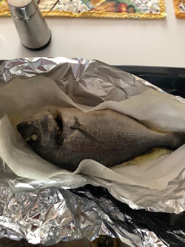 Quindi, per il massimo dello scempio iconoclastico, oggi abbiamo arruolato quattro belle orate surgelate e di Itticoltura, di fidato fornitore per lunga pregressa esperienza ed una semplice cottura al cartoccio. Meglio sarebbe dire foglio di alluminio, foglietto di carta da forno all’interno su cui adagiare il pesce ed il cartoccio stesso “accartocciato” ma con la “bocca” superiormente ben aperta.