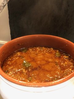 La cottura si è protratta per quasi quattro ore, senza premura alcuna, vegliando i due suidi, parenti ma qui in diversa misura e con l’antico, rassicurante abbraccio del tradizionale coccio.