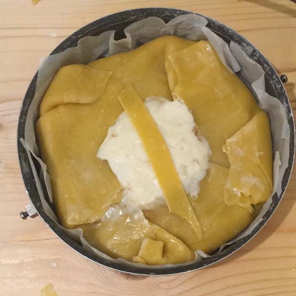 Versare la lepre, dopo di che rivoltare i bordi della pasta a coprire parzialmente la lepre.