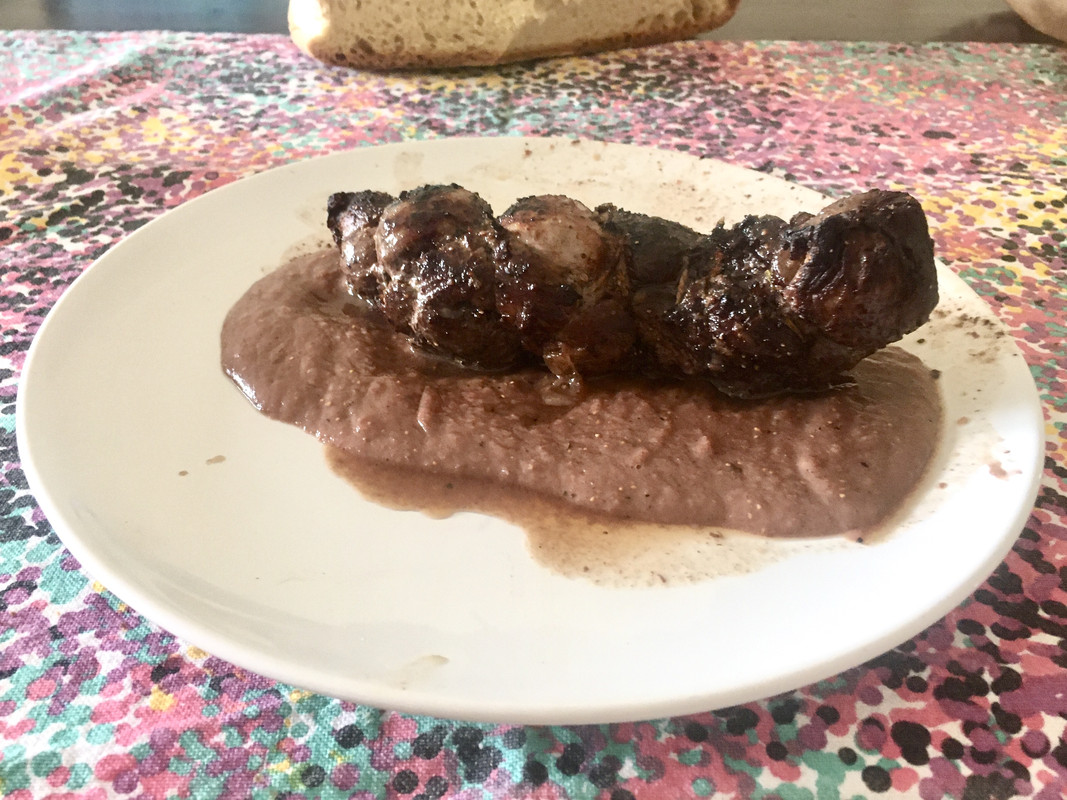 Nel fondo di cottura, a fuoco vivo mettere la cipolla, farla imbiondire poi aggiungere i fichi, salare e pepare il tutto e dopo poco sfumare con un paio di bicchieri di vino. Quando i fichi si sono disfatti, prima che tutto il vino si sia asciugato, frullare il tutto a formare un composto denso.