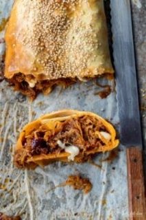 Sono da sempre stato attratto da certi “cosi misteriosì” con dentro un non so che di sorpresa… a parte gli involtini di carne (messicani), mai potuti sopportare, da me snobbati pervicacemente come roba da …bassa mensa aziendale (de gustibus eh!) Questo strudel, non dolce (cipicchia, odio il dolce, dolce!) ma “salato”, con dentro le adorate cipolle, annegate ed abbracciate dalla salsa di pomodoro, l’origano, le olive, le profumate, odorose acciughe, il saporito provolone che fila ed avvolge tutto il bendidio racchiuso in uno scrigno di acconcia pasta dorata (sfoglia, brisè…prodotta in proprio o magari anche dell’Esselunga…) e sopra una spolverata di “sesamo” che, quando facevamo la naja a Palermo e trovavamo semi simili sul buonissimo pane di Trinacria, chiamavamo “mangime per i canarini”…