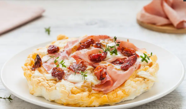 “Finta pizza” di albumi con prosciutto cotto e scamorza.
