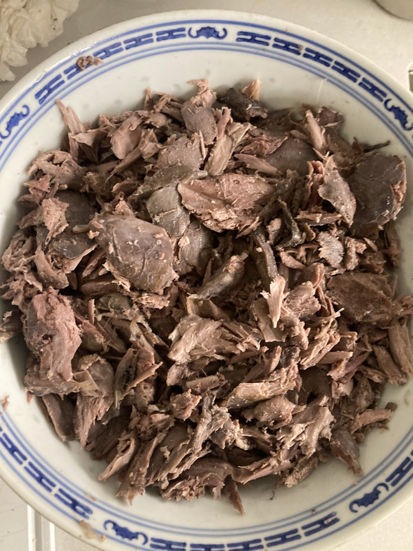 Una volta scolati, lavati e raffreddati li spolpo e li trito grossolanamente (occhio agli ossicini-tendini delle zampe)