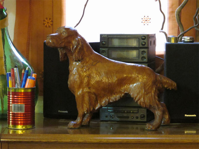 L'irlandese dovrebbe essere (almeno stando alle foto) più alto sugli arti e con un muso a mio avviso più "raffinato"... poi è una scultura non un cane vero quindi ci possono stare tante variazioni... poi se ha perso la coda come dice qualcuno probabile che si pensasse ad un setter (inteso l'artista volesse un setter)