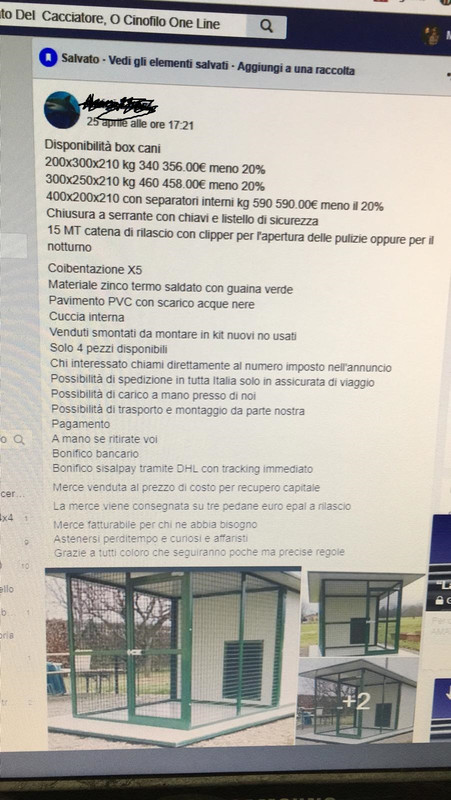 Vi volevo mettere in guarda, state attenti, tra l'altro so che il truffaldino ci sta leggendo, mi ha già anche minacciato..... allora ragazzi per farla breve provano a vendervi un box x cani, voi pagate, perchè il prezzo è buono, poi vi inventano che sono poliziotti giudiziari, e hanno sbagliato vi hanno spedito due box, vi chiedono di pagare anche l'altro perchè sennò il tribunale non lo libera, appena vi arriva lo rispedite e vi inviano i soldi indietro!!!! poi fanno passare altri po' di giorni.... e trovano la soluzione, pagate solo altri € 87, che il resto lo mettono loro, e parte la spedizione, vi mandano già le foto con il camion che stanno caricando...ma non parte... il giorno dopo ne chiedono altri 67.....insomma per farla breve il cane nel box, non ci entrerà mai.... ho chiamato l'azienda nella foto di trasporti, mi ha detto che già altre persone l'hanno contattata raccontandole la stessa storia che racconto io!!! Loro per la privacy non mi possono dare il nome di chi ha chiamato.... io vi invito a farlo, io ho già fatto denuncia, più siamo meglio è, anche l'azienda di trasporto farà denuncia.....!!!!