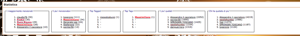 Pensa che a me sembra proprio il contrario..Statistica..... disciplina che studia quantitativamente e qualitativamente un fenomeno collettivo. Bene... questa immagine dimostra che il forum, come sottolineato migliaia di volte sta andando a “signorine di facili costumi”. Ormai i cani e la cinofilia sono un lontano ricordo e le discussioni sono ad appannaggio di pochi figuri che di buono portano il numero di contatti giornalieri.... si evince in chiave lapalissiana che : “ a dar la biada agli asini, non è che si trasformano in cavalli”.