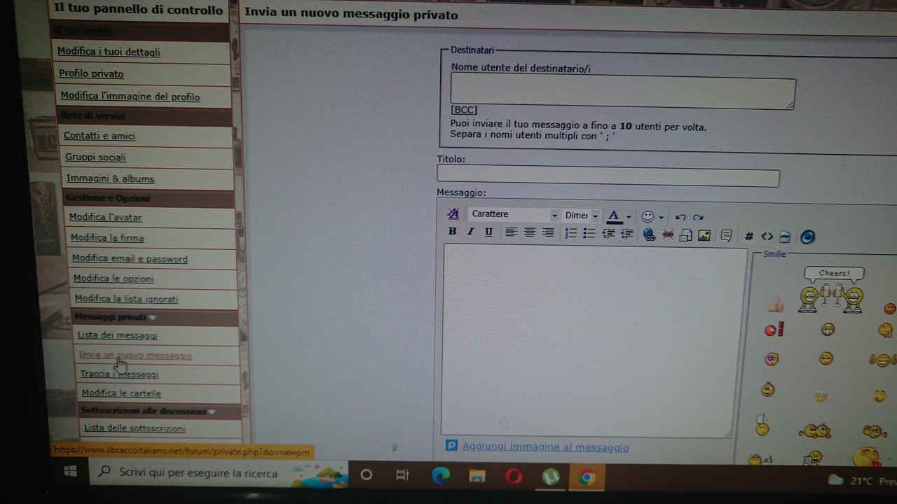 Io ti ho ringraziato del messaggio di alcuni giorni fa, che hp letto nel tuo profilo, ma del nuovo non ho visto nulla ancora. E tu hai ricevuto il messaggio che ti ho mandato oggi per dirti che non vedevo nulla? A me non risulta tra i messaggi inviati. Tra le opzioni sui messaggi ho aggiunto i messaggi degli ospiti, già che c'ero. La mia cartella è ben lontana dall'essere piena: 161 messaggi su 800. Non ci capisco un Ca Z2 O, che è la formula del cazzionato di calcio...Commenta