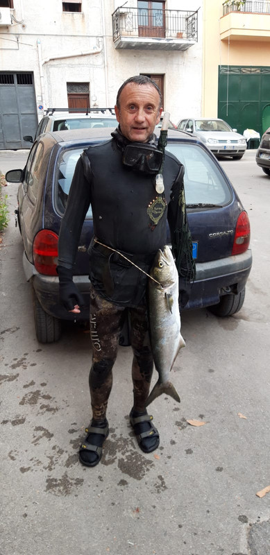 Neanche dieci minuti e padello una spigolotta stimata di poco sotto al chilogrammo...tra le onde ed il mio95 non é facile inquadrarla, per di più scarta mentre premo il grilletto, e frittata é fatta.