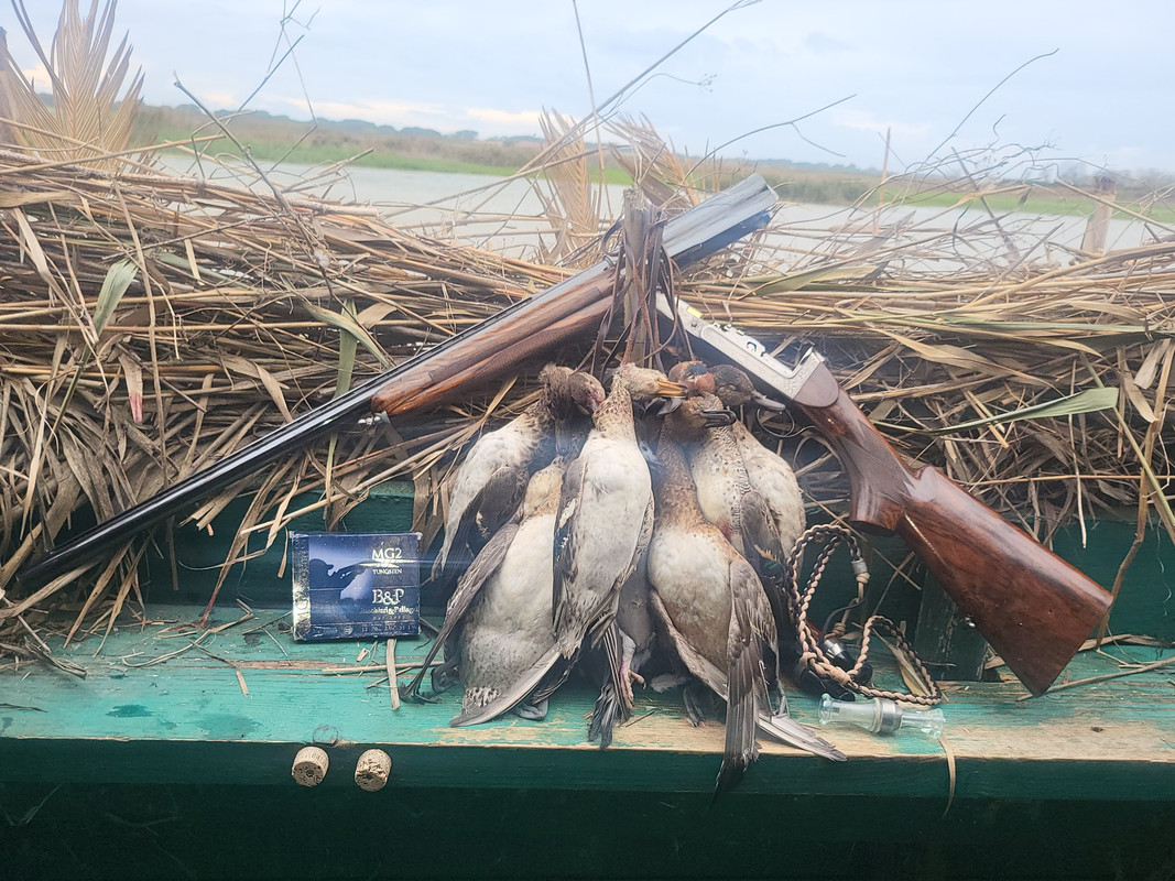 Dunque mattinata buia, entro 5 minuti prima dello start. Qualche anatra sparpagliata a sinistra e a dx delle 2 stampate oltre le consuete 5 gallinelle. Spara un collega con il suo sguazzo a circa 1 km dal mio e sento partire tante anatre da una zona buia e lontana del lago. Le gallinelle scappano nelle canne e quelle poche anatre vicine scompaiono. Il collega rispara, io non vedo nulla sino alle 6,30. Poi mi ritrovo un alzavola al centro della tesa e la fermo.