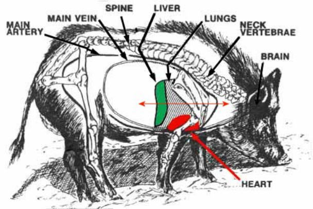 Buongiorno, non fidandomi dei tedeschi, (ci hanno già dato troppi problemi sin dai tempi di Teutoburgo, per non parlare degli ultimi 100 anni.... mi sono andato a vedere lo schema di una nota rivista americana, e mi pare avvia delle differenze rispetto a quella ammerigana Come dicono, nell'articolo in inglese, mentre al codabianca, visto la distribuzione organi, il retrospalla è il colpo migliore, sul cinghiale invece no!