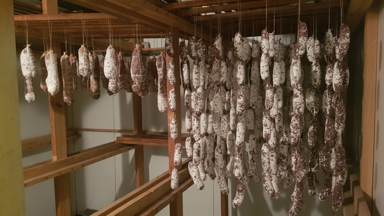 Abbiamo la fortuna che mio papà era macellaio, quindi ci sono rimaste sia l'attrezzatura per impastare/insaccare ecc., che le celle per la stagionatura dei salumi. Nella foto si vedono salami di cinghiale e salametti di cervo e di cinghiale.