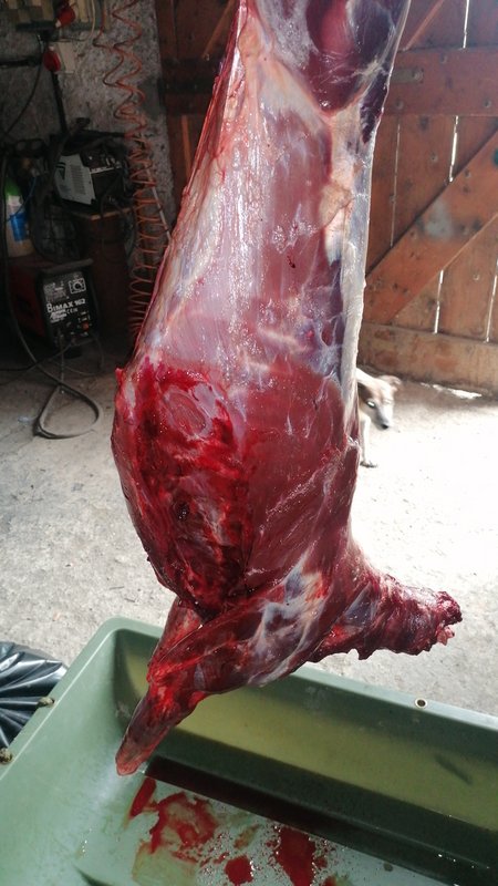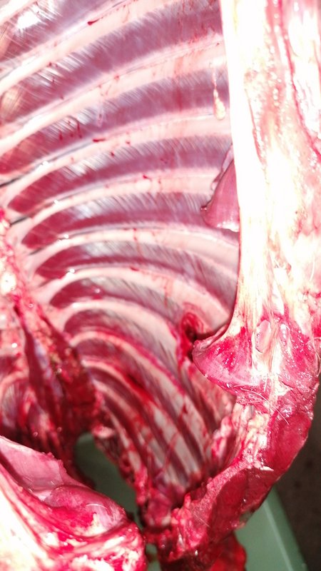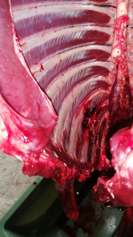 E' evidente che la palla dopo aver attraversato la cassa dell' animale si è frammentata e sulle costole lato uscita le feriste sono multiple. Sembra una piccola "rosata".