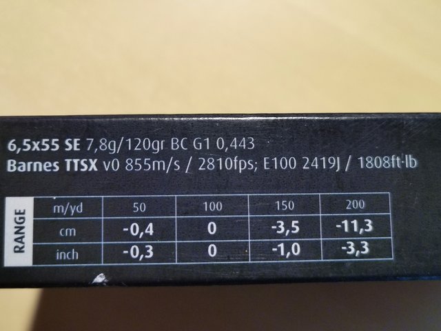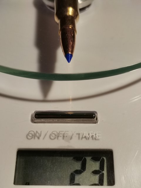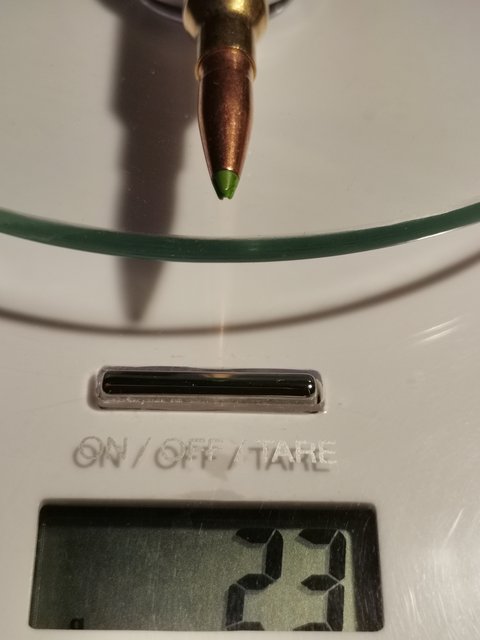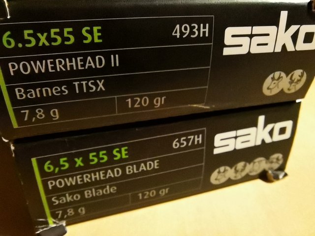 come da foto abbiamo due diversi caricamenti da 6,5x55SE, entrambi Sako, il primo con palla Barnes TTSX e il secondo con palla Sako BLADE. Entrambe le palle pesano 7,8g/120gr. La munizione completa pesa 23 grammi, ma agitandola si percepisce che con il caricamento Barnes la polvere è libera di muoversi, mentre con la palla Sako la polvere sembra che riempa tutto il bossolo. Questo fa pensare che la palla BLADE sia più lunga della TTSX, anzi molto di più tenendo presente che come si evince da una delle foto il caricamento completo è più lungo di qualche mm rispetto al caricamento con palla TTSX. Mi pare strano, ad ogni modo se così fosse stando alla teoria la palla dovrebbe avere una minore stabilità in volo e non interagire perfettamente con il passo di rigatura. Che io sappia con le monolitiche questo "problema" era stato risolto riducendo appunto la granitura potendo mantenere così la lunghezza della palla, altrimenti dovrebbe variare il peso specifico.