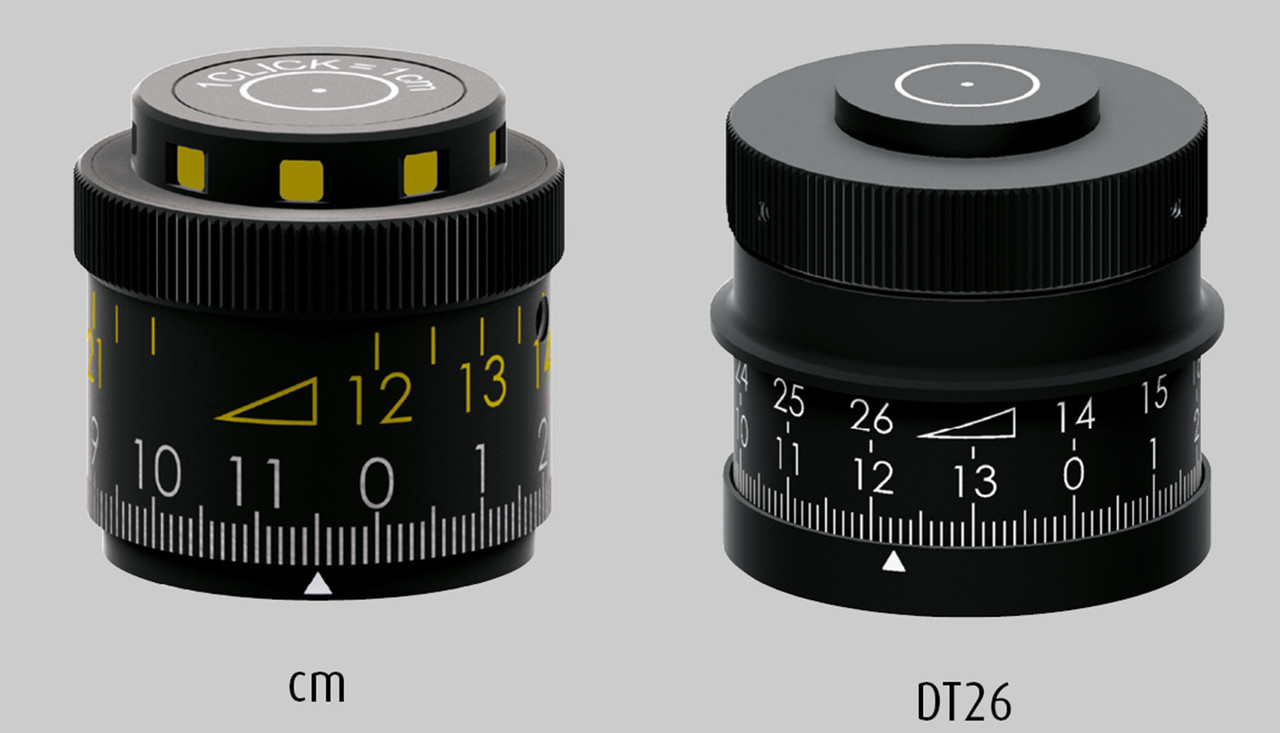 La prima è la Double Turn, tutte le correzioni oltre i 13 Mil sono sul secondo giro (indicato dal giallo dietro le finestrelle); l'altra è la MTC (More Tactile Clicks), in cui ogni 10 click (1 Mil) l'ultimo è più avvertibile (sembra che la corsa sia finita, ma in realtà continua), per cui è più semplice contare anche senza leggere direttamente sulla scala quanti click sono impostati.