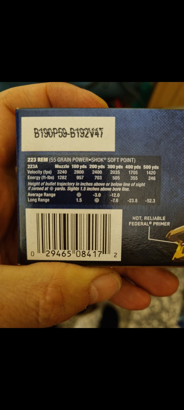 Posto le foto dei dati impostati per la mia palla 223 federal power shok 55 granj