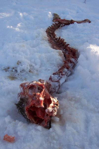 Certamente è stato un intervento multispecie in quanto mi sono accorto della carcassa vedendo "decollare" una cornacchia in mezzo alla neve...Però la predazione primaria rimane secondo me dovuta al lupo. Le condizioni della carcassa non differiscono quasi per niente dal capriolo recuperato quest'estate il mattino che era stato sparato la sera precedente.Non ho dubbi che tu sia sicuro che siano lupi. Tuttavia, a questo punto di consumo della carcassa potrebbe essere stato chiunque. Più ragionevole anche un intervento "multispecie".