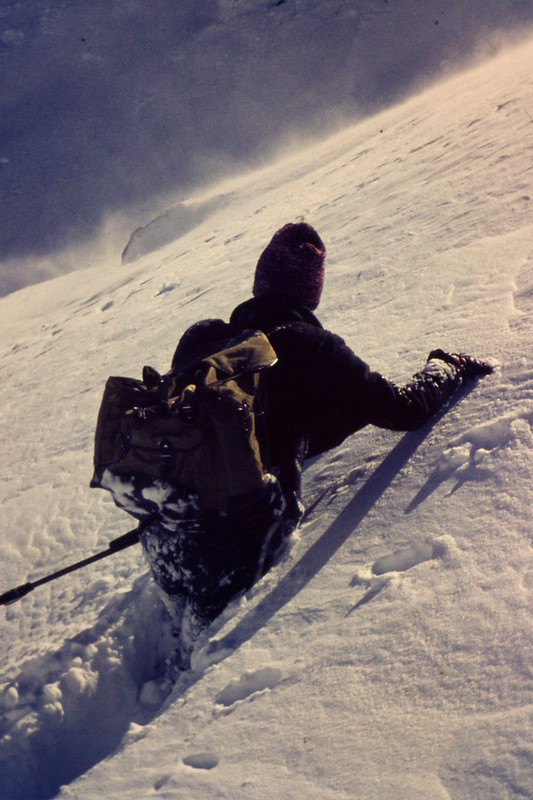 Ti posto una foto ... ho cacciato in questi ambienti per decine di anni, oggi mi rifiuterei, la foto è brutta, è tratta da una vecchia diapositiva ormai sbiadita, ha 40-50 anni, a quei tempi con cinghiette in cuoio sotto lo scarpone e attacco sulle stringhe .... la neve si infiltrava alla grandeDrool].