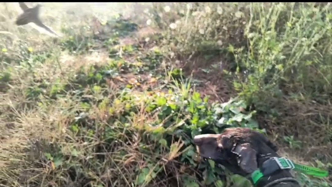 Poco dopo i miei Pointer, mi pare anche goffamente, alzano uno strano uccello rossastro che vola via con le zampe a pendoloni, da pensare ad una Starna ferita.