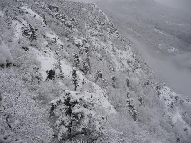 Il percorso è disagevole e pericoloso, sono da solo e non è proprio il caso di farsi male. Lastre di roccia liscia e gelata, tronchi abbattuti dalle slavine e rocche strapiombo sotanno lì ad aspettare un mio errore. Se non altro la vegetazione aiuta e evtare i salti di roccia, anche se la neve ti infradicia.
