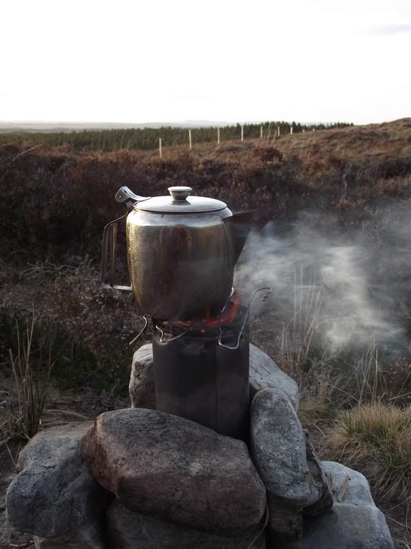 Siamo arrivati a un piccolo torrente, in modo da impostare il mio zaino e tirò fuori la mia "stufa hobo" e bollitore. Ho trovato e vecchio pezzo di pino e tritate nel cuore di esso per ottenere i trucioli di legno secco. Ho anche raccolto alcuni erba secca qua e là. Ho riempito il bollitore, e si accese una palude erba secca nella hobo-stufa. Presto la stufa era ruggente e il bollitore ebollizione.