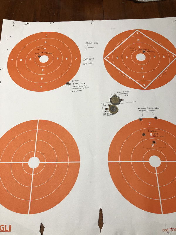 Non ho piu toccato l'ottica,volevo vedere come andavano due fucilate assieme. Con le Sako 165gr mirando al barilotto basso a sx una fucilata e' andata quasi dentro all'altra.Al barilotto basso di dx due ricariche con V160 palla accubond da 160gr.Un rosata da meno di due € l'altra da un €. Le altre non le ho considerate.Purtroppo mi sto accorgendo che la vista mi sta un po tradendo,ho bisogno di avere un reticolo che si veda bene,perche' la croce fine non riesco piu a vederla,mi si copriva un po il centro,..insomma ho fatto quello che ho potuto.Voi cosa ne pensate[:-golf]