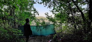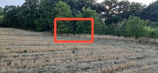 Dalle foto sembra che tu sia nascosto, ma perchè la macchina fotografica vede buio tra due cespuglioni che ti proiettano la loro ombra, ma non sono tanto sicuro che un occhio umano o animale non veda nella zona d'ombra, anche perchè quell'obiettivo (telefono?) fa sembrare 35 metri come fossero 100...Prova ad andare tu a quella distanza e guarda se distingui il telo...Commenta