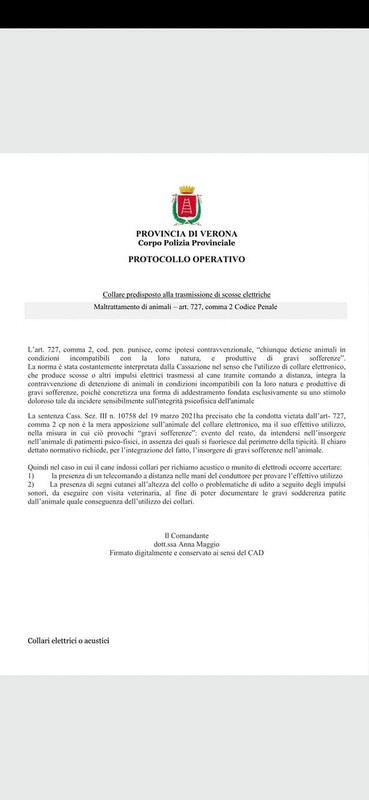 Ho allegato una recente sentenza della cassazione che assolve un cacciatore che aveva fatto indossare al cane il collare elettrico ( ma non avevano trovato il telecomando) e per l'uso del beeper in quanto dopo averlo visitato il veterinario certificava che il cane ci sentiva benissimo. Mi è stata girata una circolare ( non ho conferme al momento che sia vera, ma la prendo per buona) della provinciale di verona per cui se si trova un cane con collare elettronico gli agenti devono cercare il radiocomando per il CE o, nel caso del beeper, mandare a visita vererinaria il cane.