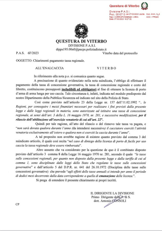 ''....Quindi è stata una fesseria totale di andare a chiedere alla Agenzia delle entrate un parere sul valore della licenza di caccia. Il problema da risolvere non c'entra assolutamente nulla con il fisco e con la tassa di concessione governativa per cacciare. Resta comunque da capire perché dopo aver chiesto il parere alla Agenzia delle entrate ed averlo ricevuto, lo abbiano tenuto nascosto per ben sei anni. Forse si erano resi conto che non c'entrava!