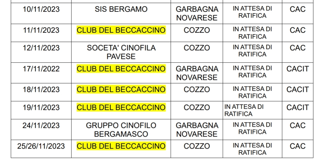 allegando schermata di parte del calendario prove a beccaccini organizzate dal club che si svolgeranno nel mese di Novembre.
