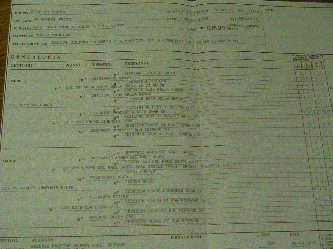 Non so esattamente cosa si intende per lavoro, ma a guardare il pedigree direi che puoi rivolgerti a Meloni o Capelli (che non sono molto distanti da te) per cercare un rientro di Olaf o Gaia o da Lacchini per quanti riguarda i della Chiusa. Prova a chiedere a Bruno Decca (Alboinensis su questo forum), che dovrebbe saperne abbastanza di queste linee.L'indulgenza verso sé stessi induce ad essere accondiscendenti verso le scorrettezze altrui. Gamsbart PowerCommenta