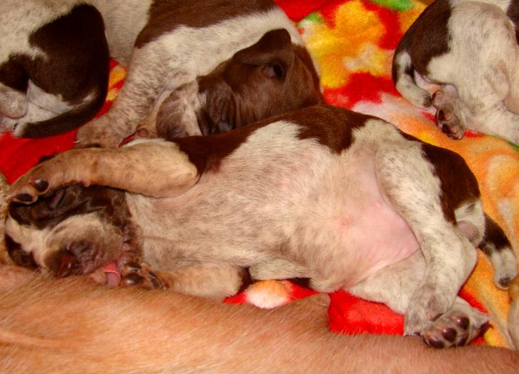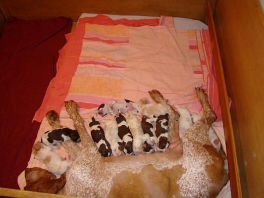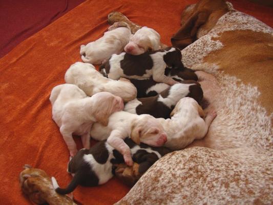 Visti gli ottimi risultati ottenuti con questi cuccioli ,sia in prove di lavoro, che in expò, hanno voluto ripetere la cucciolata,e dopo i fatidici 2 mesi e una pancia colossale,TA-DAM! 12 pargoli!6 roani e 6 bianco arancio