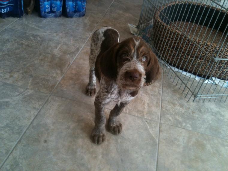 vi presento barba dell'Adige (Spino) cucciolo r.m. di poco meno di tre mesi, proveniente come da affisso dall'All.to dell'Adige di San Miniato (PI); il piccolo italico barbuto, mio primo spinone che in conseguenza del suo acquisto mi ha battezzato anche socio CISP, assieme ad un setter inglese e ad un kurzhaar va a completare la mia piccola ma variegata "scuderia" di fermatori.