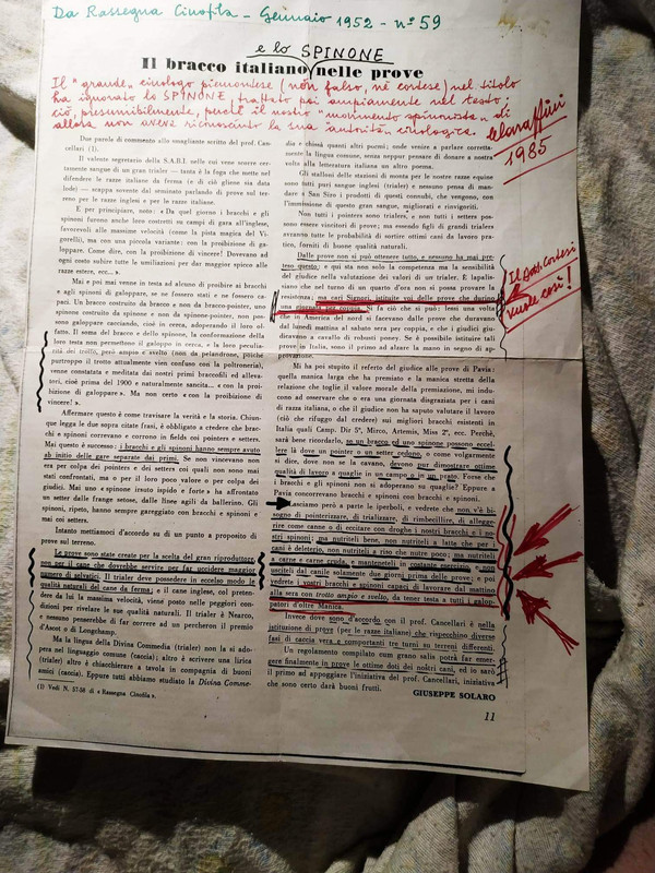 Non ne sono certo, ma presumo che il Dott. Brianzi fosse convinto di quell'origine antichissima dello spinone, per il fatto che ebbe particolare preferenza per i bianchi e in riferimento alla composizione della pelle dello spinone. La supposizione del Dott.Amaldi ha riscontro nell'analogia tra la consistenza della pelle di certi segugi primitivi del montanari, tuttora esistenti ( oggi definiti dell'appennino) e quella degli Spinoni tipici ( Secca, spessa e coriacea).