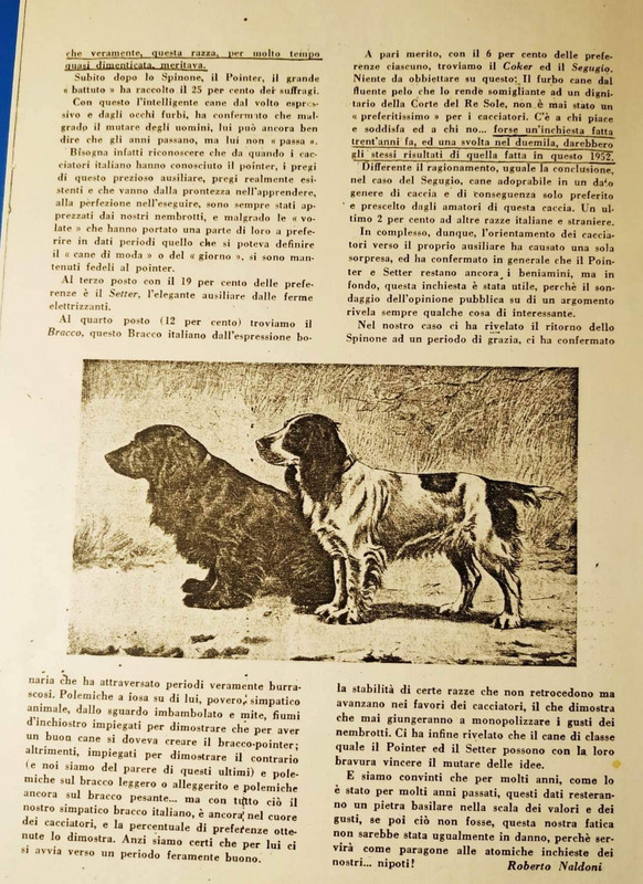 Comunque trovo molto costruttivo questo argomento nei forum ed è un vero piacere vedere delle differenze di punti di vista che secondo me comunque hanno una forte congruenza degli aspetti più tipici e salienti dello spinone. E io posseggo degli spinoni di media taglia, nello standard costruiti nel rettangolo, eccellenti cacciatori e lenti e metodici se paragonati ai bracchi o ovviamente agli inglesi. Tutto ciò non a discapito della efficacia a caccia. È questione di stile ma rispetta i moderni non sono dei Bastardi veloci… Lo posso garantire. La pelle ed il pelo consente di entrare in alcune Rovi da fare spettacolo … A tal proposito lo scorso anno per recuperare una beccaccia magistralmente fermata dallo spinone; il cane , è scomparsoin una montagna di rovi per il recupero, quando gli altri cani non appoggiavano neanche il muso. Ri posso garantire che non credo di avere bastardi o peggio cyber spinoni. Rivoluzione consiste anche nell’uomo, Meroni euro e alti in media 1 m 70, i miei figli a 11 anni sono già 1,70 m, Muscolosi, longilinei perché figli di una cultura alimentare anche diversa. Io credo che la crescita dello spinone e non la trasformazione sia da valorizzare ed apprezzare salvaguardando quello che di buono il passato ci ha tramandato.
