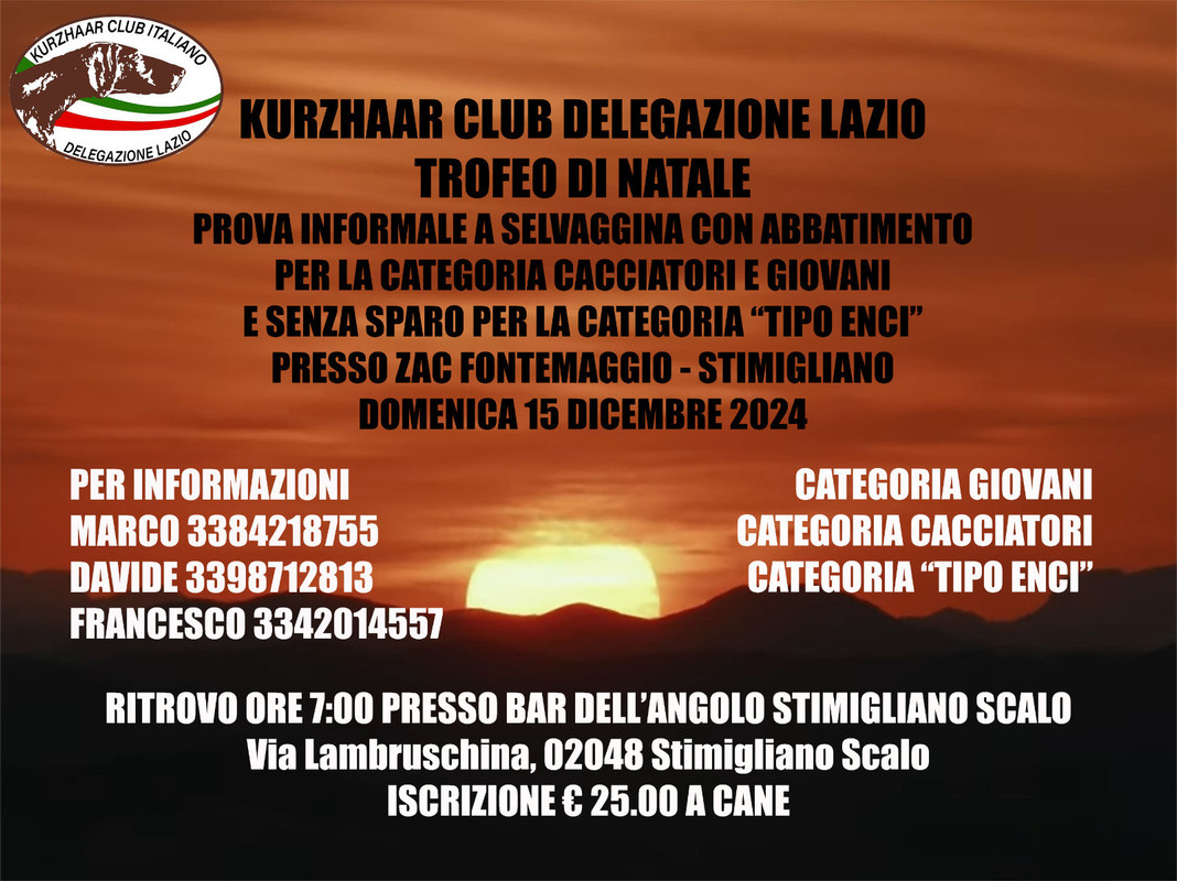 Stimigliano- ZAC Fontemaggio (RI)- Trofeo di Natale-Prova informale a selvaggina naturale a selvatico abbattuto ( Cat Cacciatori e Giovani) e senza abbattimento (cat. ENCI)