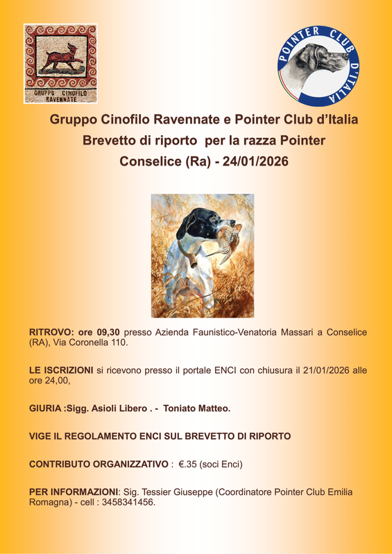 CONSELICE (RA)-Prove di caccia su selvaggina naturale per razze da ferma-BREVETTO DI RIPORTO PER RAZZA POINTER-Speciale Pointer inglese