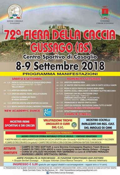Buonasera, anche quest'anno si ripete la tradizionale fiera della cacccia di Gussago (Bs) sembrerebbe, rispetto allo scorso anno, che ci sia l'esposizione di armi sportive e da caccia oltre ad esposizioni canine ed ornitologiche come da tradizione. Le date sono, Sabato 8 e domenica 9 Settembre 2018. -