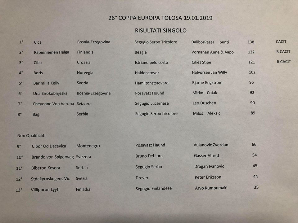 In categoria SOLO ha vinto la Bosnia e Herzegovina con un Segugio serbo tricolore femmina di nome di CICA (138 punti CACIT), proprietario e conduttore Dalibor Pezer,