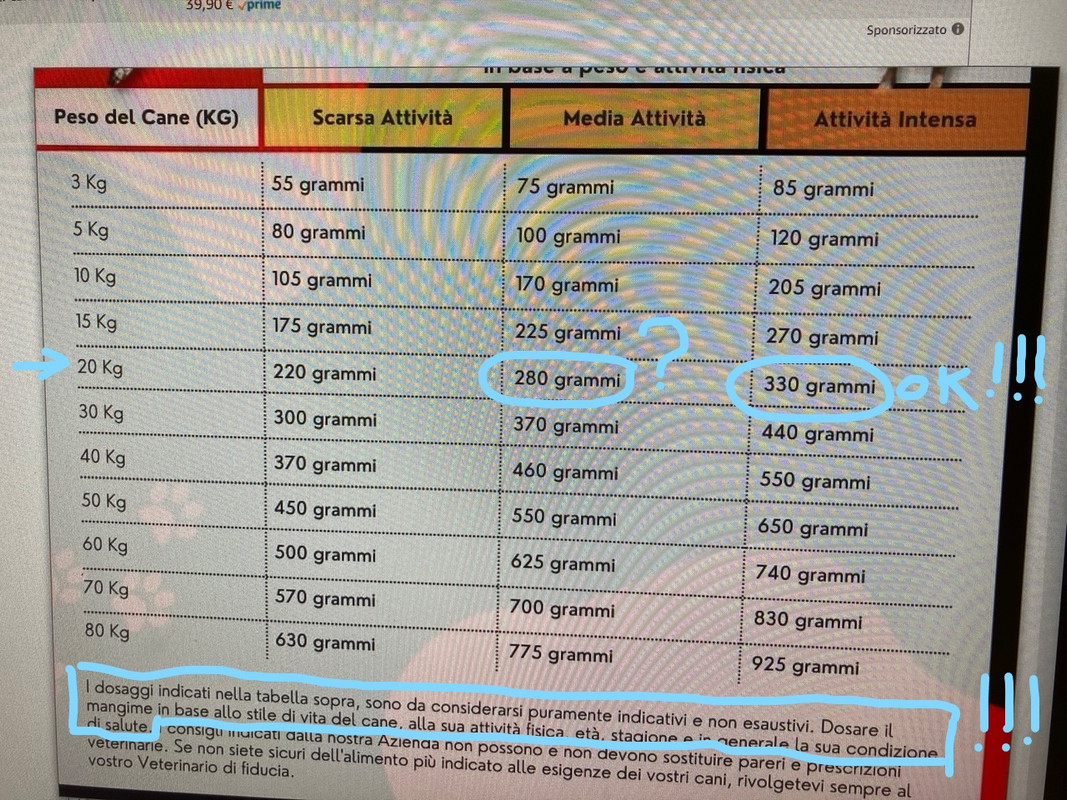 n.b. La tabella e' presa dalla confezione delle crocchette che tu usi !