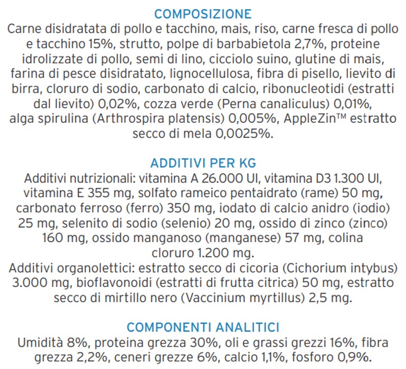 composizione pollo disossato (28%), proteine di pollo disidratate (27%), patata dolce, grasso di pollo, uova essiccate, aringa, proteina di aringa disidratata, olio di pesce (da aringa), fibra di piselli, carote essiccate, farina di erba medica, cartilagine di pollo (fonte di glucosamina e solfato di condroitina), inulina, fruttoligosaccaridi, estratto di lievito (fonte di manno-oligo-saccaridi), melagrano essiccato (0.5%), mela essiccata, spinaci essiccati, bucce e semi di psillio (0.3%), arancia dolce essiccata, mirtillo essiccato, cloruro di sodio, lievito di birra essiccato, curcuma (0.2%), estratto di Aloe vera.