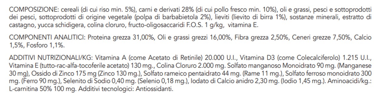 additivi per kg Additivi nutrizionali: Vitamina A 16000UI; Vitamina D3 1600UI; Vitamina E 600mg; Vitamina C 160mg; Niacina 40mg; Calcio D-pantotenato 16mg; Vitamina B2 8mg; Vitamina B6 6.4mg; Vitamina B1 4.8mg; Biotina 0.40mg; acido folico 0.48mg; Vitamina B12 0.1mg; Cloruro di colina 2800mg; Beta-carotene 1.5mg; Zinco (chelato di zinco dell'analogo idrossilato della metionina): 163.8mg; Manganese (chelato di manganese dell'analogo idrossilato della metionina): 64.6mg; Ferro [chelato di ferro (II) di idrato di glicina]: 58.3mg; Rame (chelato di rame dell'analogo idrossilato della metionina): 15.8mg; Selenio (lievito al selenio inattivato): 0.00088; DL-metionina, tecnicamente pura 4000mg; Taurina 1000mg; L-Carnitina 300mg. Additivi organolettici: estratto di tè verde 100mg; estratto di rosmarino. Antiossidanti: estratti di tocoferolo da oli vegetali.