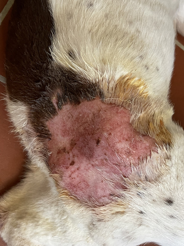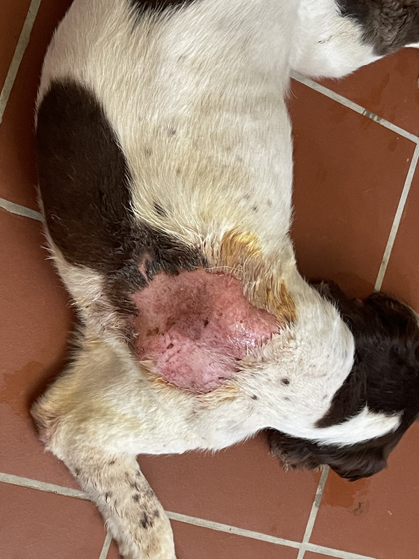 Springer spaniel, maschio, 15 anni: domenica non aveva niente, a parte gli acciacchi dell’ età ma a 15 anni sono più che comprensibili, lunedì inizio a notare una macchietta grossa cieca 0,5 cm sulla groppa, dimostratasi poi pus giallo grigio della consistenza del grasso. Da allora si è sempre estesa fino a circa la dimensione di circa 25 cm, ma se lo tocco sei vede che si stacca altro pelo lasciando la pelle viva sotto.