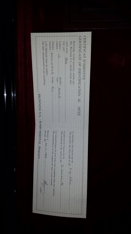 Complimenti, fucile eccezionale ; ha meritato di finire nelle mani di un collezionista ... Dall'importante certificato della Browning (ingrandendolo) si legge che il fucile è uscito dalla storica sede di Herstal nel novembre 1998, e reca il nome dell'incisore e anche del tecnico che ha curato il montaggio .... Fa parte delle ultime produzioni ; l'ultima è quella "Final Tribute" del 1999 realizzata in 1000 esemplari .Ultima modifica louison; 29-07-20, 16:18.Commenta