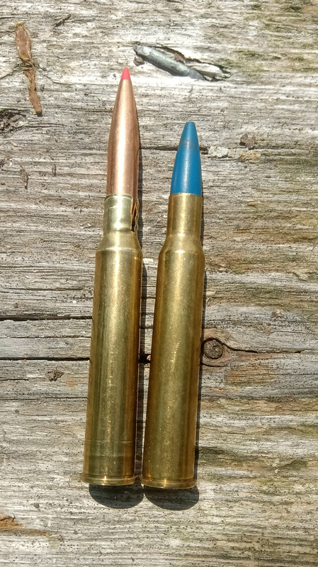 La cartuccia di sinistra ha free bore zero, quella di destra è un caricamento originale con palla barnes da 160 grani. Per trovare il free bore zero ho dovuto utilizzare una palla da 162 grani, perchè con quelle che utilizzo a caccia ( 154 gr ) non erano lunghe abbastanza da poter essere spinte