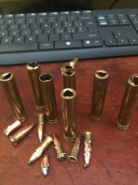 Un “lotto” aggiuntivo di bossoli Weatherby a marchio weatherby di primo sparo, recuperati da un amico e mai ricaricati, arruolati per peso e volume agli stessi valori di propellente, palla ed innesco citati per completare l’infornata di cartucce esaurendo così “la latta” (“la plastica” non sta bene!) della N165 con le ultime 8 confetture da affiancare alle Norma.