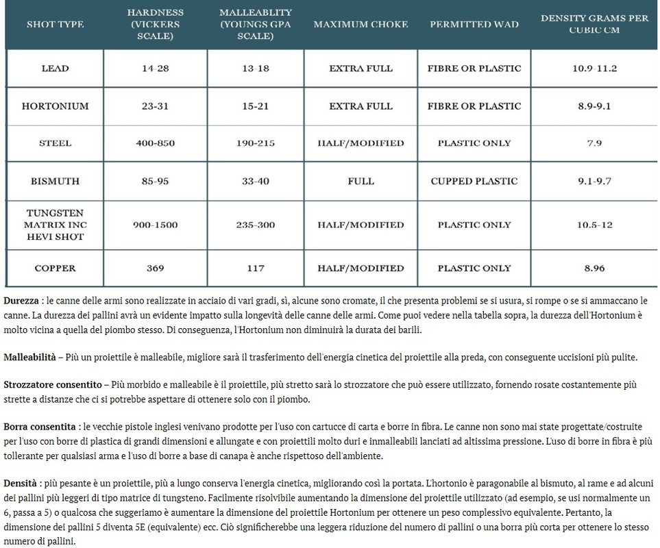 La ditta inglese Horton ha messo a punto una propria lega chiamata ORTONIUM con caratteristiche molto simili al piombo. A marzo dovrebbe incominciare a commercializzare pallini con questa lega al prezzo di 18€. al kg. tenendo conto dei costi di spedizione e delle tasse doganali, si potrà averlo intorno ai 25/26 euro, che non è la metà ma quasi del costo del bismuto.