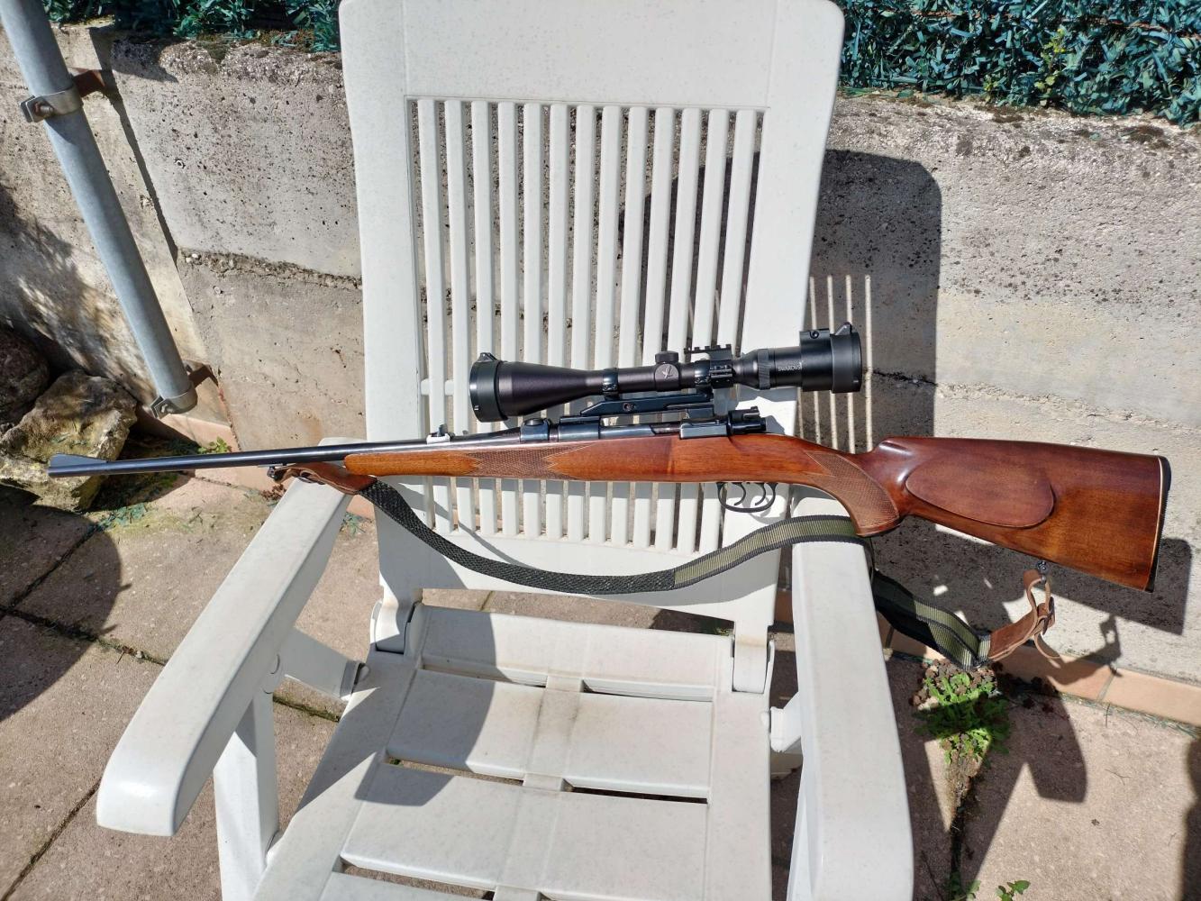 Classica carabina su azione Mauser K98 di derivazione militare su cui hanno montato una canna Krupp Essen, cambiato la calciatura e sostituito lo scatto con il classico deutscher stecker, credo sia artigianale, in germania se ne trovano tantissimi in tutti i calibri. Questo bancato a Ulm nel maggio 1968