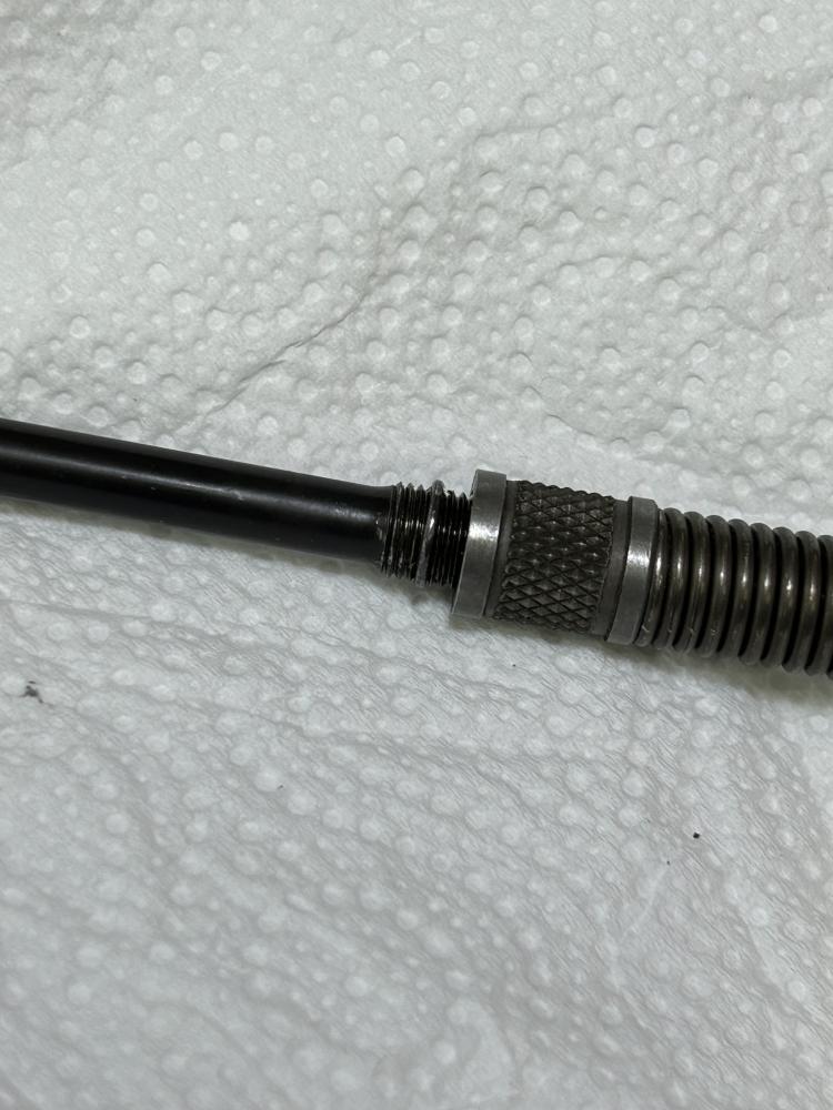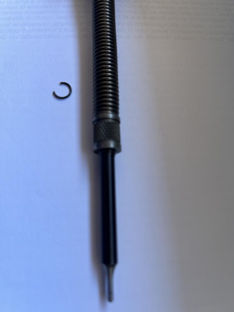 La coda ha una filettatura che si avvita nel cilindro dell'otturatore. La filettatura ha una parte terminale liscia di sezione leggermente inferiore alla filettatura che si incastra nella molla del percussore. L'altro capo della molla appoggia su una piccola boccola che si incastra in un'altra boccola, un pò più grande, che è filettata nella sezione interna per avvitarsi sulla filettatura a circa 3/4 del percussore per bloccare la molla. Per conferma, quell'anello/spacer aperto , era infilato di fronte e libero ?